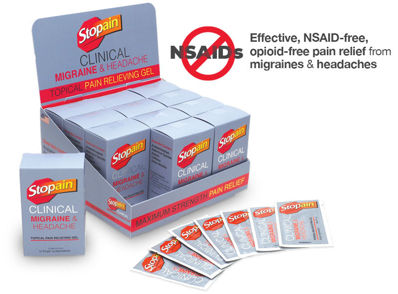 The Only Topical Gel Specially Formulated for Relief from Migraines & Headaches! Stopain® Clinical Migraine & Headache is a safe, effective topical gel for migraine and headache relief. It does not contain acetaminophen, addictive opioids, aspirin, caffeine, or other NSAIDs. There are no known drug interactions and can be used in conjunction with prescription medications.