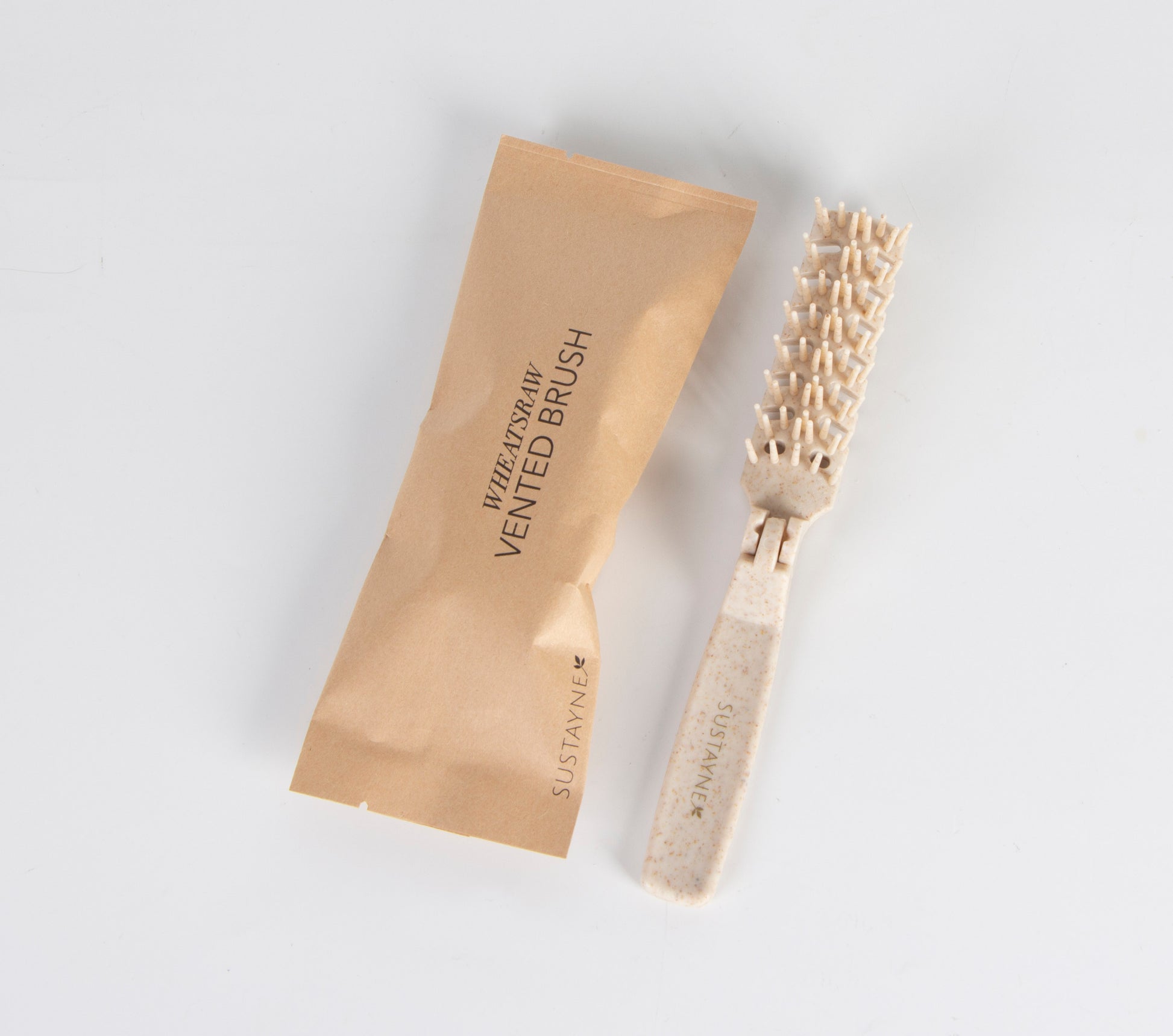 Convenient for purses, gym bags, and toiletry bags! Help guests keep their locks tangle-free with this foldable wheat straw brush. These sturdy, attractive hospitality amenities make a bold statement that you’re taking steps to minimize environmental impact. Free of BPA and phthalates. 7" L. Individually packaged in an FSC-certified kraft paper sachet.