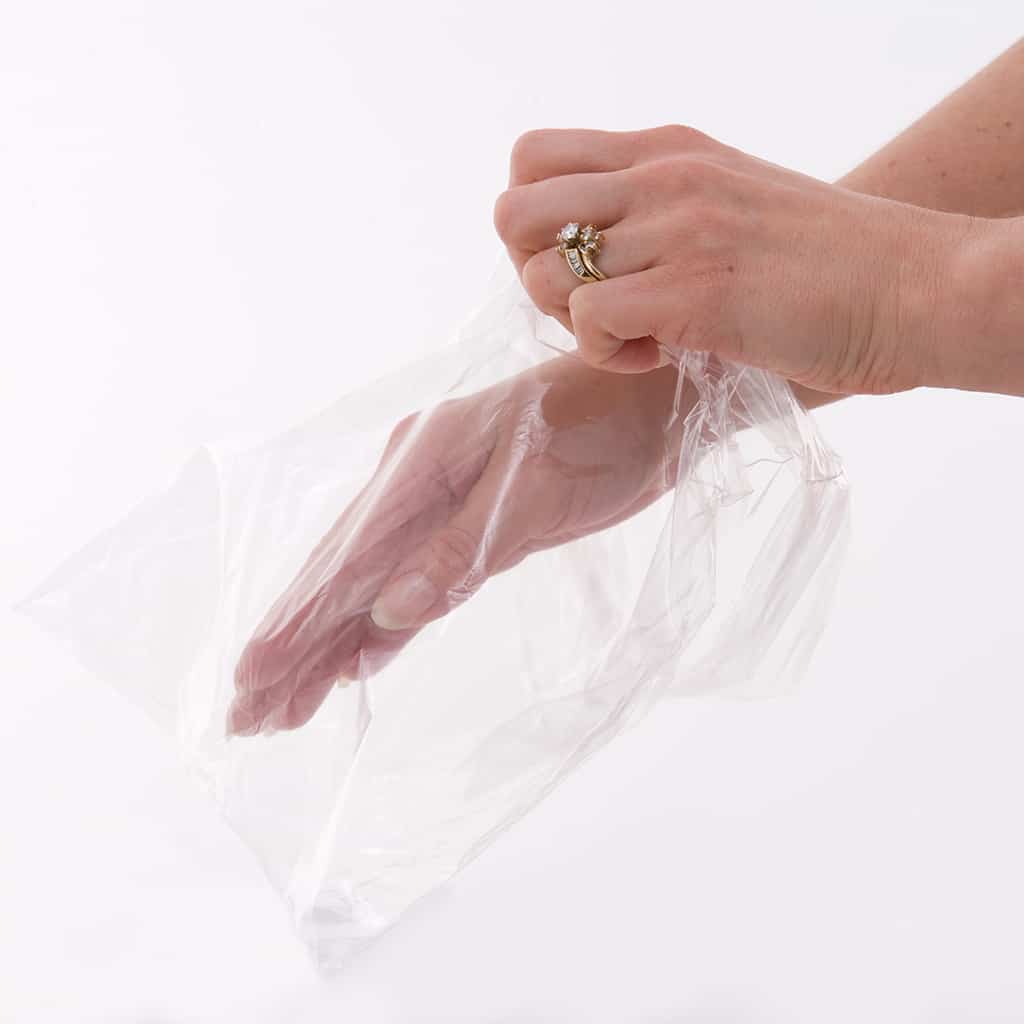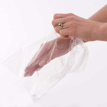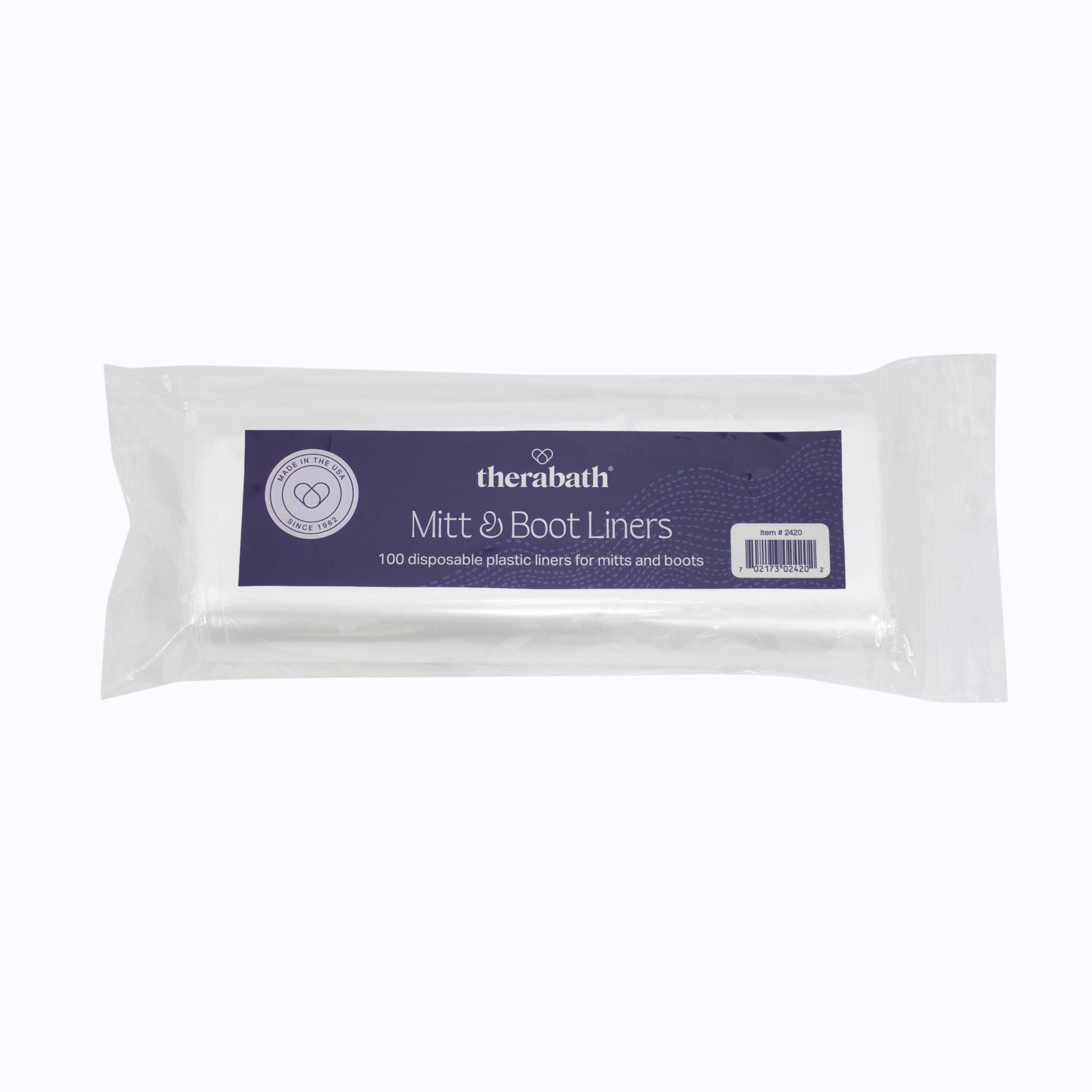 Durable, disposable Therabath® Boot/Mitt Liner Bags 9" x 15". Stapled to a header card for easy dispensing. Contains 100 liners.