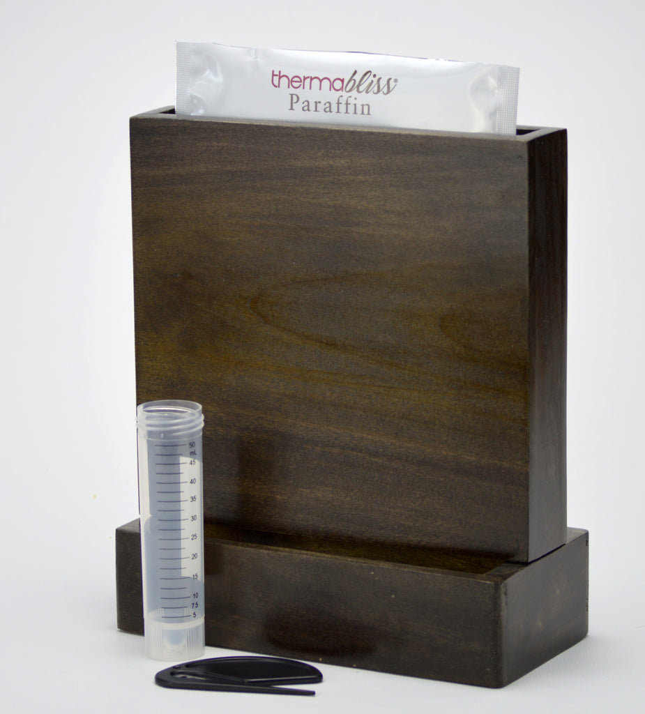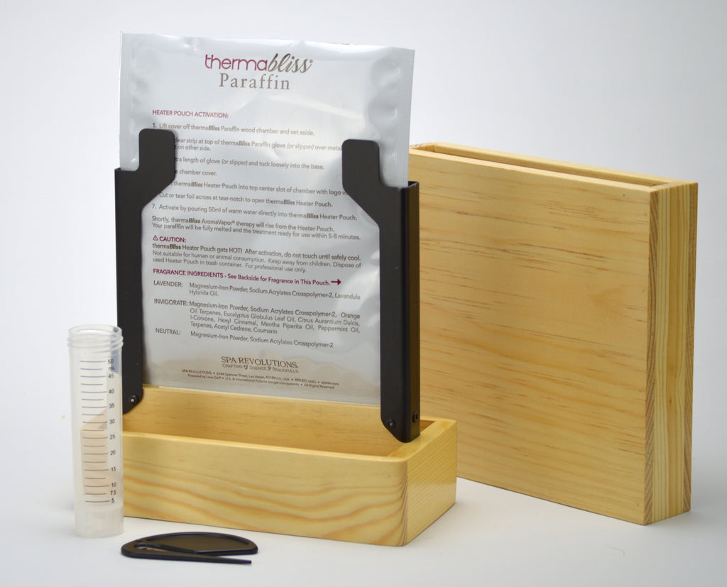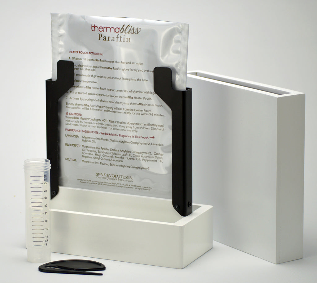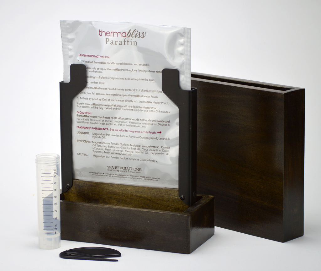 These attractive natural wood heating chambers feature an ultra-compact design that uses a patented mineral heater pouch activated by tap water. It melts client-exclusive thermaBliss hands and feet paraffin treatments in just 6 minutes! No electricity or batteries required.
