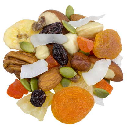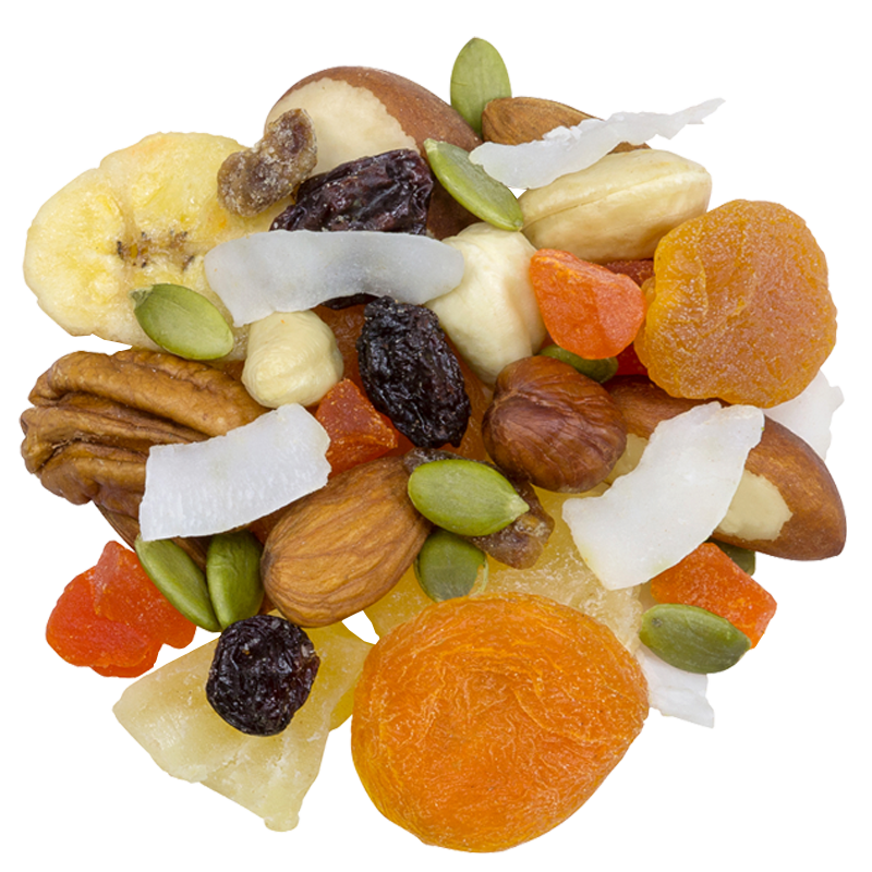 Raisins, Turkish Apricots, Dates, Coconut, Almonds, Papaya, Pineapple, Brazil Nuts, Banana Chips, Pecans Pumpkin Seeds, Cashews, Hazelnuts, Walnuts