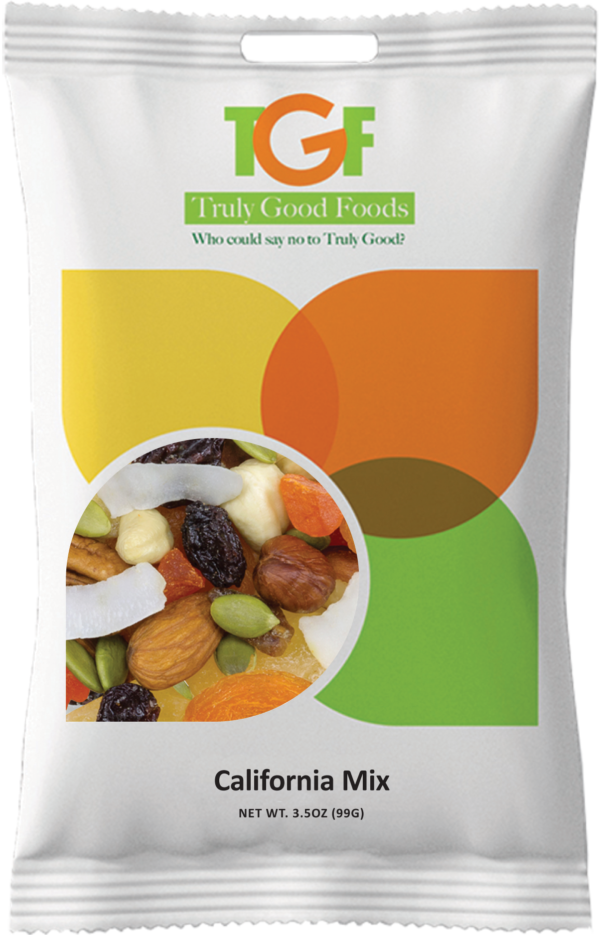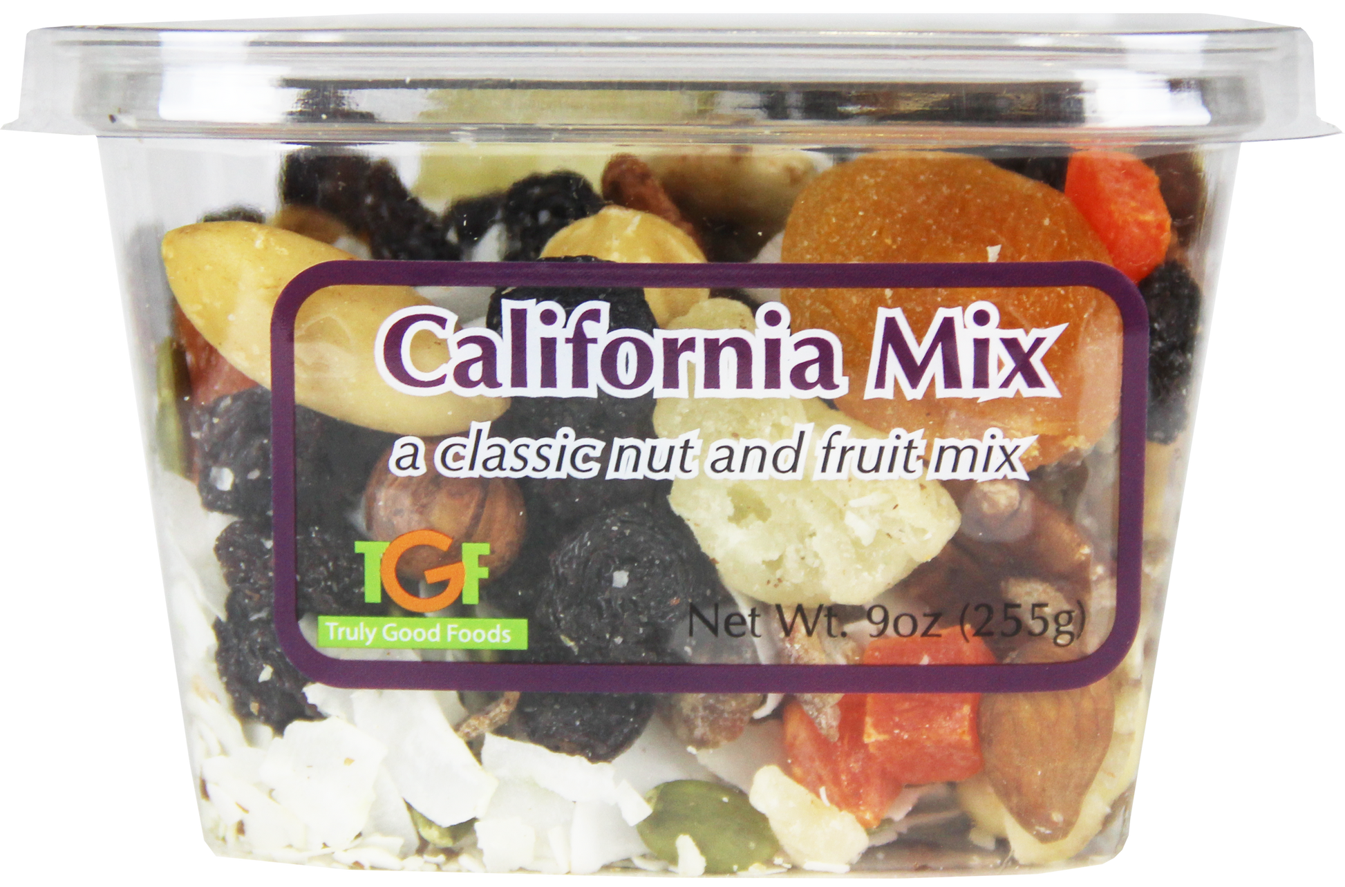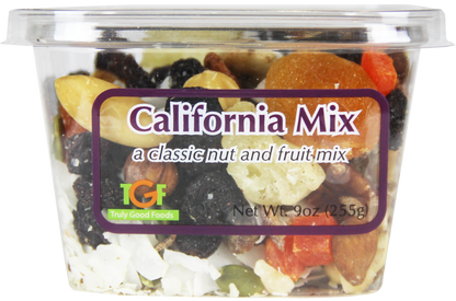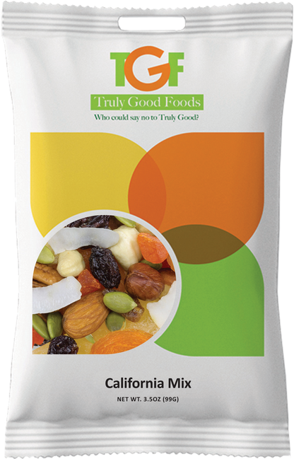 California Mix™ send your guests' taste buds straight to the sandy beaches of California. This mix is combines raisins, Turkish apricots, date pieces, almonds, coconut flakes, papaya chunks, pineapple chunks, brazil nuts, banana chips, pecans, pumpkin seeds, hazelnuts, and walnuts.