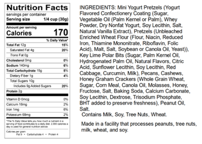 Key Lime Crunch includes Key Lime Bits, Mini Yogurt Pretzels, Roasted and Salted Pecan Halves, Honey Graham Toasters, and Roasted and Salted Cashews.