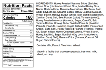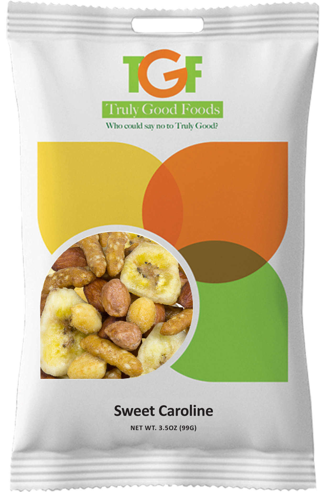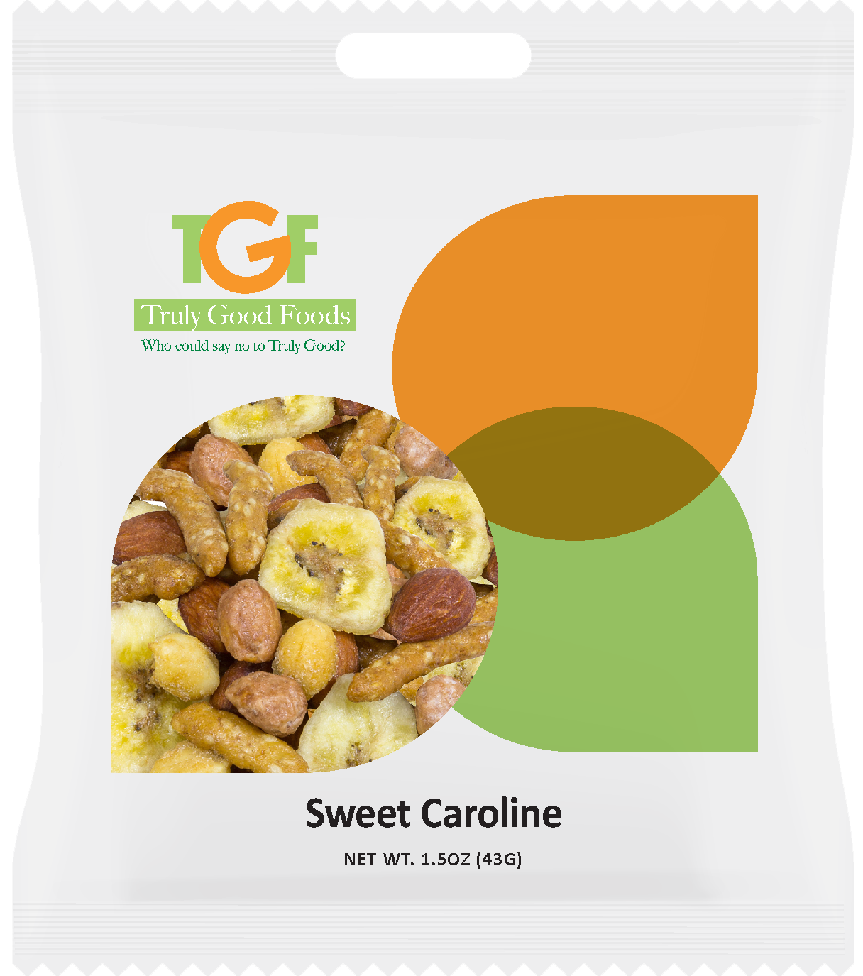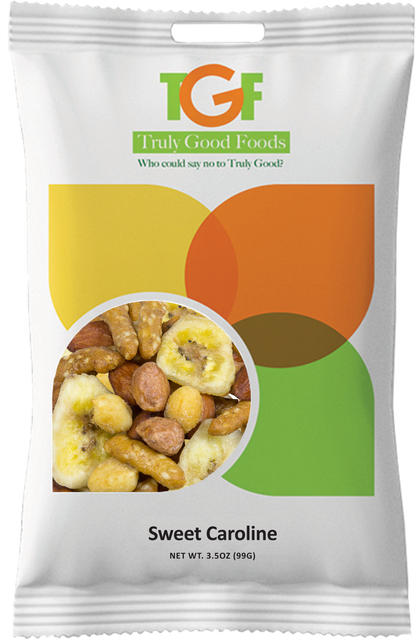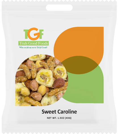 Just like the song (So Good, So Good), this is a wicked good snack mix. Sweet Caroline® is a crunchy mix that makes the perfect sweet treat. It has honey roasted sesame sticks, butter toasted peanuts, honey roasted almonds, honey roasted peanuts, and banana chips.