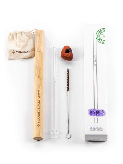 The Crystal Straw by VitaJuwel is more than just a sweet-looking accessory–it’s a great instrument for guests to infuse their drinks with natural gemstone energies. It includes a borosilicate glass straw, genuine red jasper gemstone, a plastic-free cleaning brush, and a bamboo carry case.