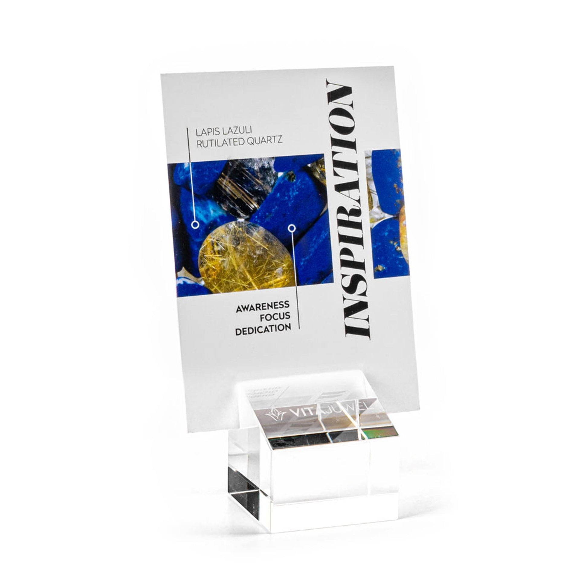 Beautifully showcase gemstone blends and intended functions with VitaJuwel gemstone cards. You can display them in your spa’s retail area, or alongside the dispensers in your reception or treatment area. Includes 12 cards plus a sleek glass stand. Cards are 4"x3" and the stand is 1.33"x1.33".