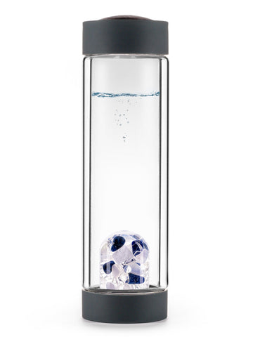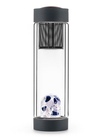 This Crystal Infusion Bottle with genuine gems features lab-quality, double-walled glass for insulation. Your guests can enjoy the sparkle of their favorite gemstone blend inside the bottle while brewing tea on-the-go with the extra-large tea strainer (sold separately). The bottle stays cool to the touch while offering crystal vibes for hot or cool drinks. Engineered in the German Alps. Made in Germany. Bottle holds 12.2 fl. oz.