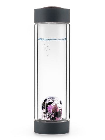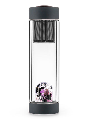 This Crystal Infusion Bottle with genuine gems features lab-quality, double-walled glass for insulation. Your guests can enjoy the sparkle of their favorite gemstone blend inside the bottle while brewing tea on-the-go with the extra-large tea strainer (sold separately). The bottle stays cool to the touch while offering crystal vibes for hot or cool drinks. Engineered in the German Alps. Made in Germany. Bottle holds 12.2 fl. oz.