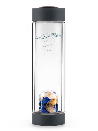 This Crystal Infusion Bottle with genuine gems features lab-quality, double-walled glass for insulation. Your guests can enjoy the sparkle of their favorite gemstone blend inside the bottle while brewing tea on-the-go with the extra-large tea strainer (sold separately). The bottle stays cool to the touch while offering crystal vibes for hot or cool drinks. Engineered in the German Alps. Made in Germany. Bottle holds 12.2 fl. oz.