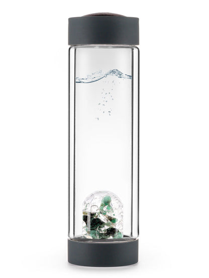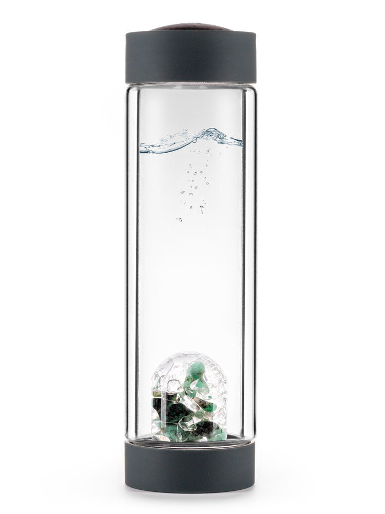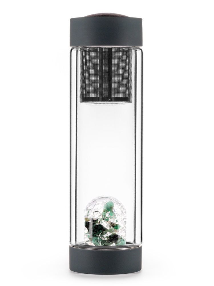 This Crystal Infusion Bottle with genuine gems features lab-quality, double-walled glass for insulation. Your guests can enjoy the sparkle of their favorite gemstone blend inside the bottle while brewing tea on-the-go with the extra-large tea strainer (sold separately). The bottle stays cool to the touch while offering crystal vibes for hot or cool drinks. Engineered in the German Alps. Made in Germany. Bottle holds 12.2 fl. oz.