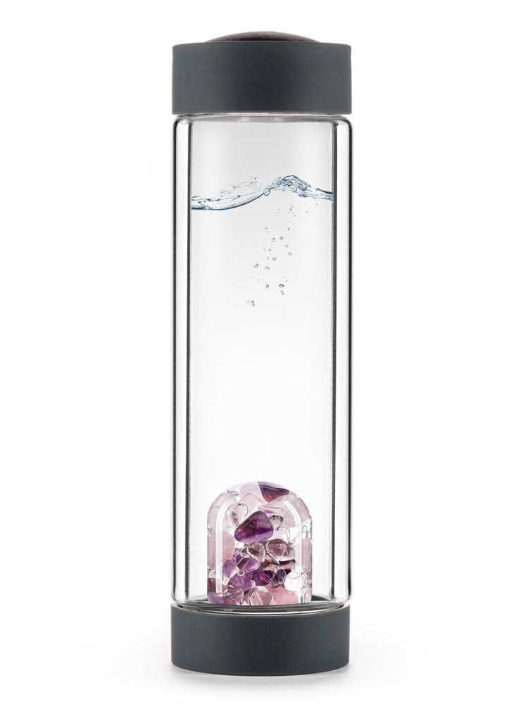 This Crystal Infusion Bottle with genuine gems features lab-quality, double-walled glass for insulation. Your guests can enjoy the sparkle of their favorite gemstone blend inside the bottle while brewing tea on-the-go with the extra-large tea strainer (sold separately). The bottle stays cool to the touch while offering crystal vibes for hot or cool drinks. Engineered in the German Alps. Made in Germany. Bottle holds 12.2 fl. oz.