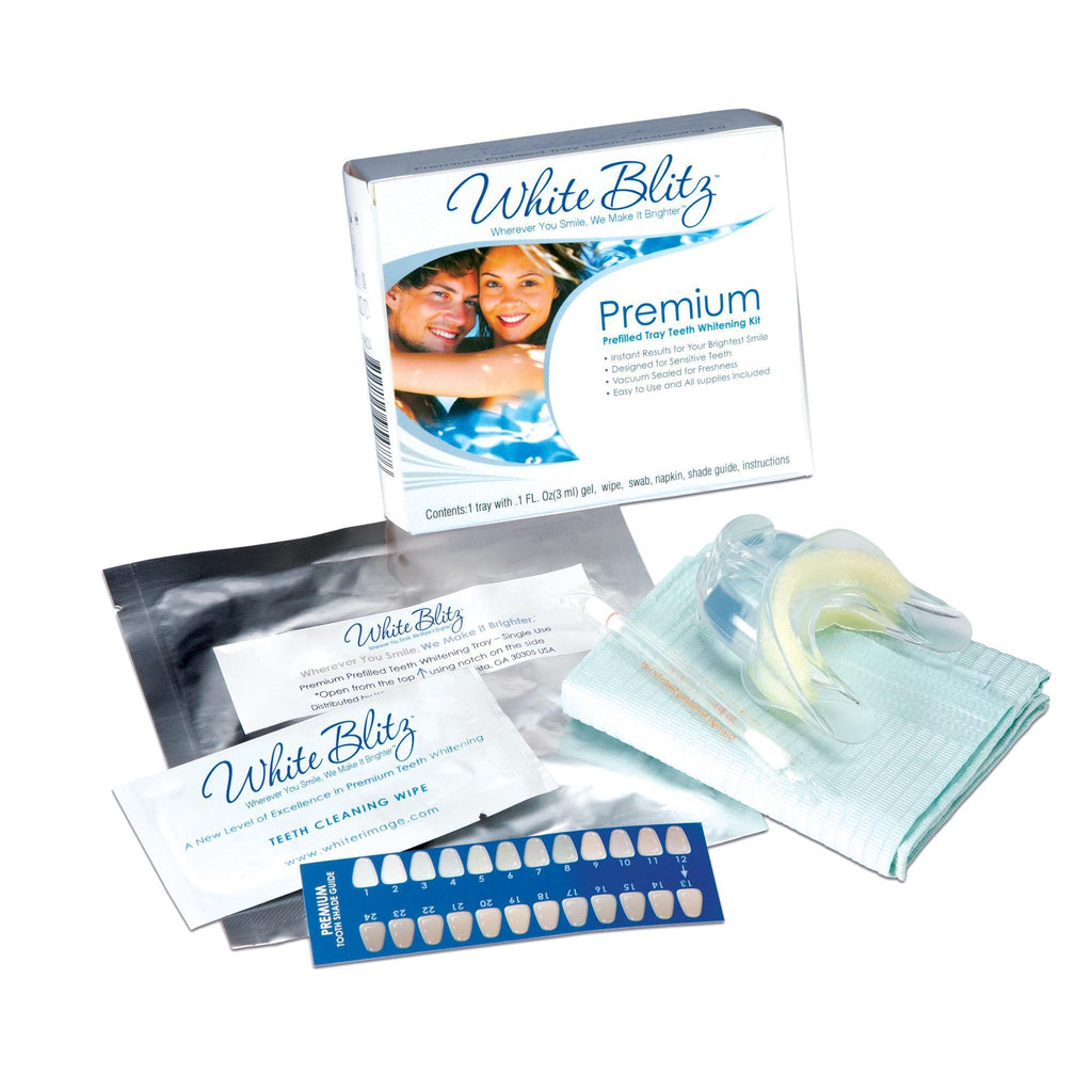 This advanced tray system in conjunction with the White Blitz Premium Teeth Whitening light offers instant results in as little as 15 minutes with no hassle and no mess. Here are just a few of this system’s features:-Each kit comes with all supplies needed for LED whitening including a bib, teeth wipes, vitamin E lip moisturizer, and disposable tooth shade guide.