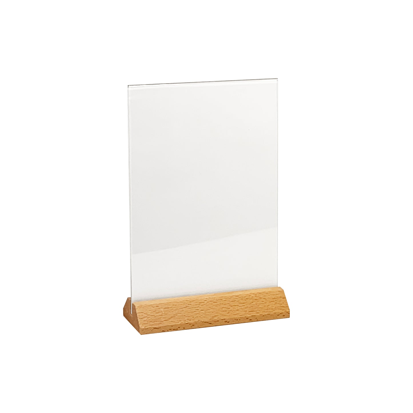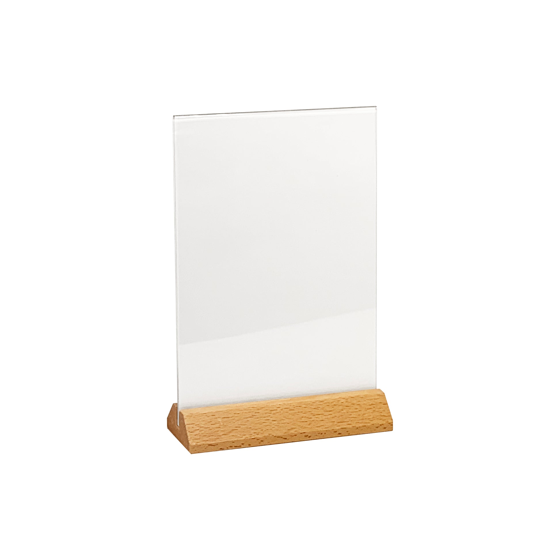 Upgrade your displays with elegance and clarity using this set of 3 acrylic sign holders, each complemented by a sturdy wooden base. Crafted for superior durability and exceptional transparency, these high-quality acrylic holders ensure your messages stand out with unparalleled clarity. Designed with a weighted wooden base for stability in busy spaces, each T-shaped holder measures 5" x 7", perfect for impactful product showcases or promotions. Elevate your messaging with streamlined sophistication.